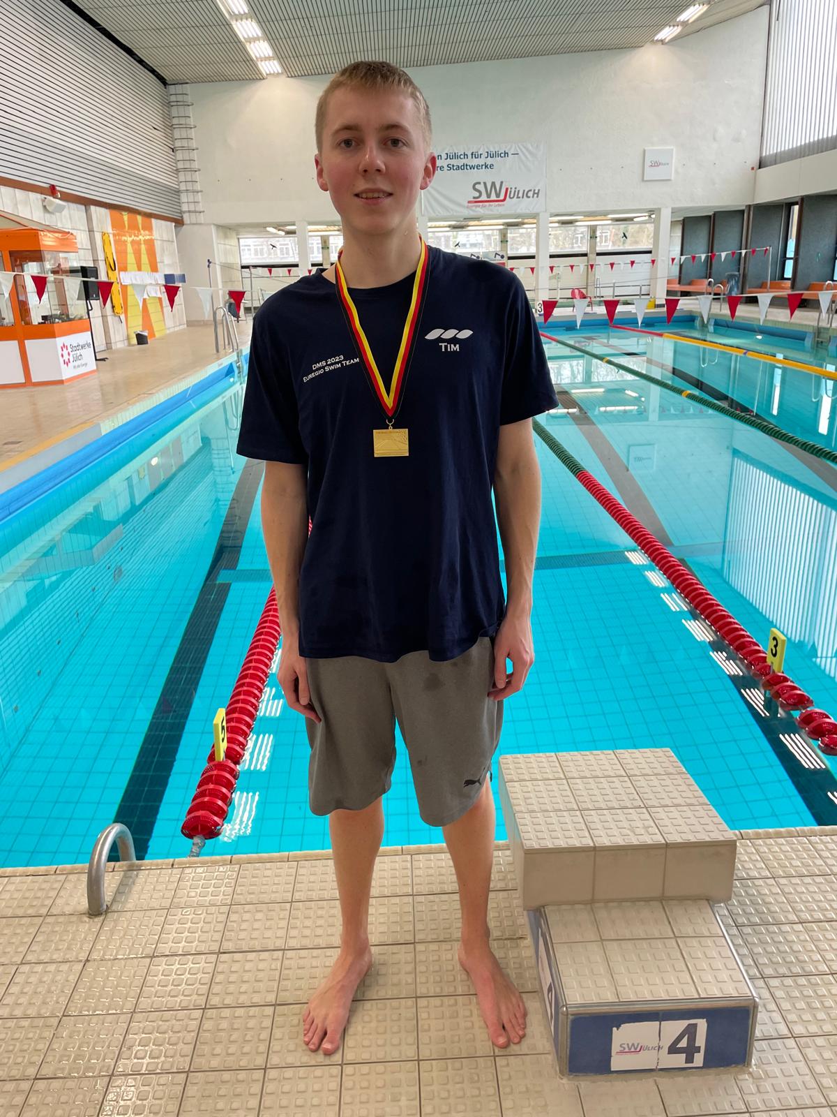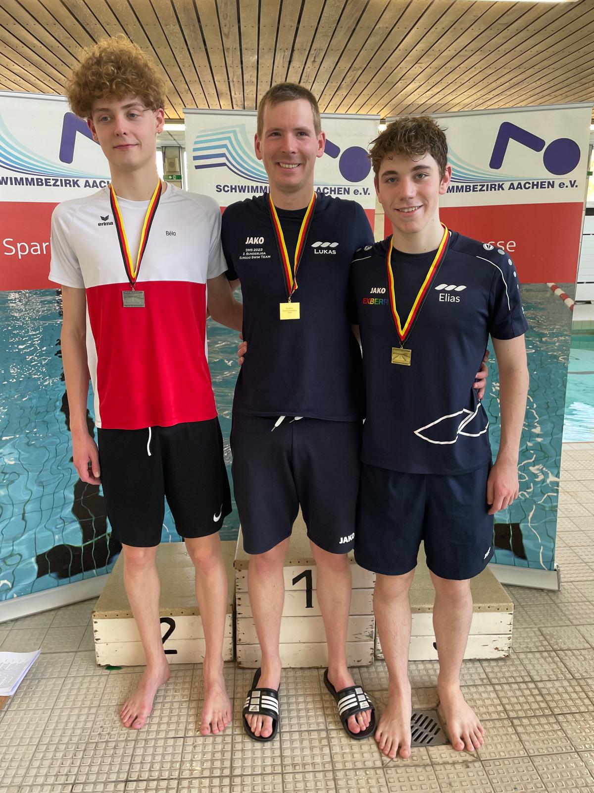 Wie sollte es anders sein: Lukas Bücker stand bei den Bezirksmeisterschaften „Lange Strecken“ in der offenen Klasse bei den Freistilstrecken als Sieger ganz oben auf dem Podest. Gold gab es für ihn über in 800 Meter Freistil in 08:39,80 Minuten und 1500 Meter Freistil in 16:25,05 Minuten. Den Titel über 400 Meter Lagen gab Lukas an Tim Faulwetter weiter, der in 04:45,76 Minuten zum Sieg schwamm. Über 800 Meter Freistil gesellte sich Tim mit Silbermedaille zu Lukas aufs Treppchen und über 1500 Meter Freistil Elias Lamberty (Jahrgang 2007), der sich über Bronze in der offenen Klasse freute. Lea Bayer holte Gold über 800 Meter Freistil im Jahrgang 2011 sowie Silber über 400 Meter Lagen. Zweimal Silber in der Jahrgangswertung (400 Meter Lagen, 1500 Meter Freistil) erschwamm Elias. Jan Schacht (Jahrgang 2007) belegte den Bronzeplatz über 400 Meter Lagen.